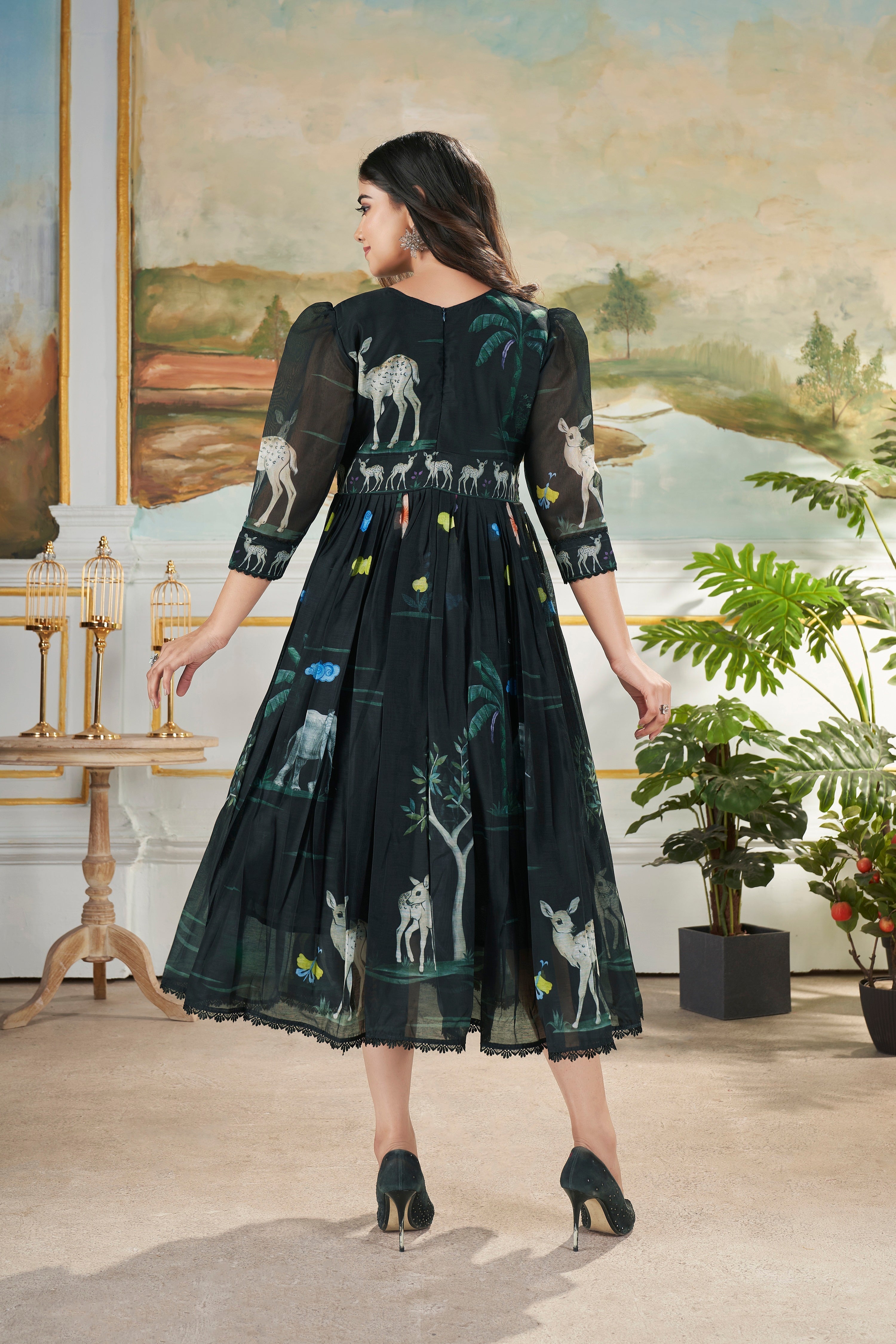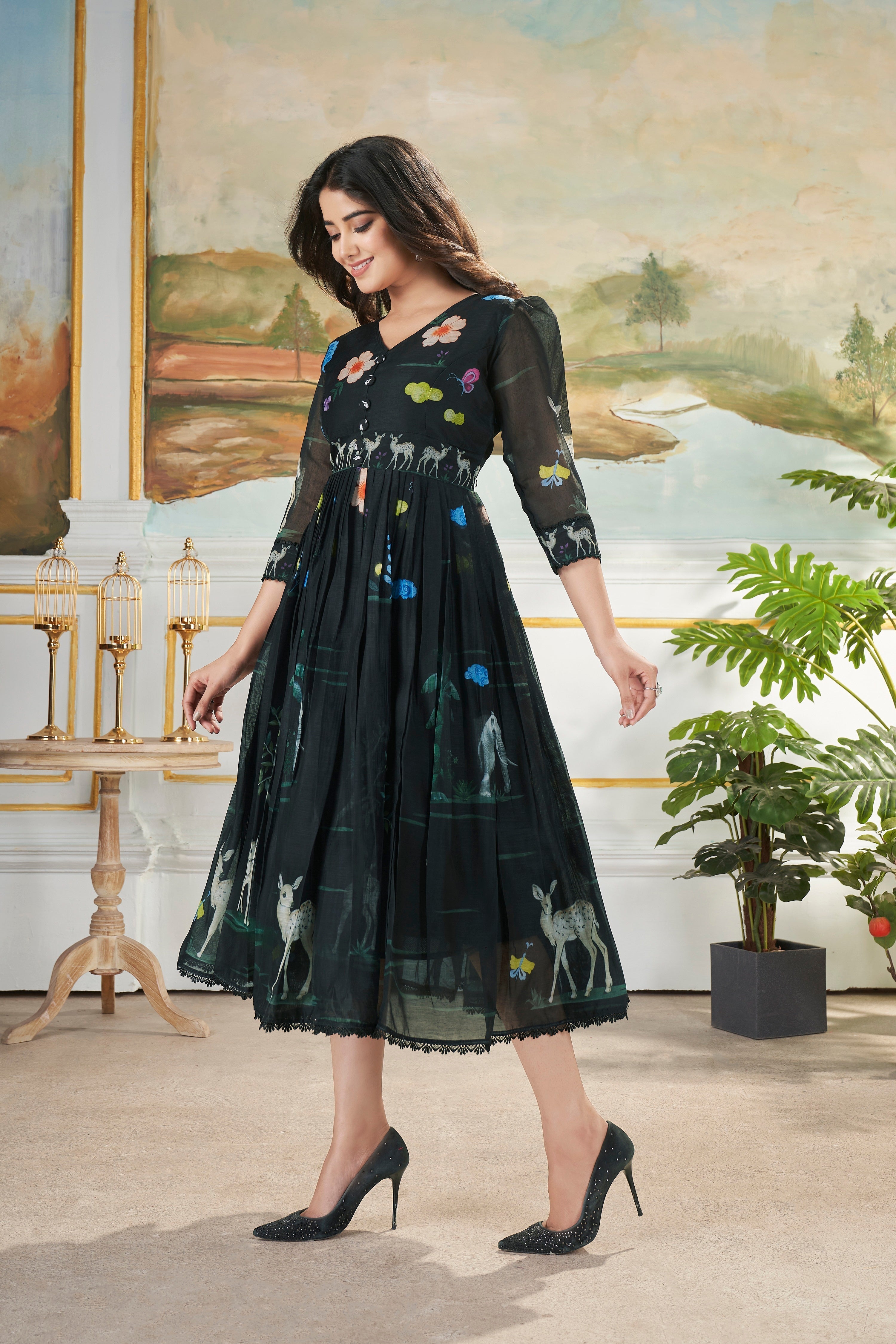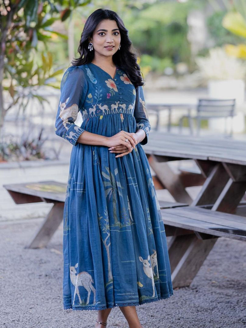 AARVI - LONG WESTERN DRESS made"An elegant maxi dress crafted from a soft Chanderi mix fabric. Features flowy silhouettes adorned with delicate nature-inspired prints. Perfect for a graceful, relaxed, and stylish look."