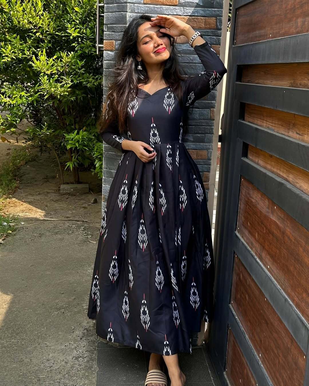 | KARKI-LONG WESTERN FLORAL FROCK . black cotton-blend maxi dress features an Ikat-inspired all-over print, a sweetheart neckline, and three-quarter sleeves, offering a graceful yet comfortable fit. Perfect for casual and semi-formal occasions, its flared silhouette adds an elegant touch. | |