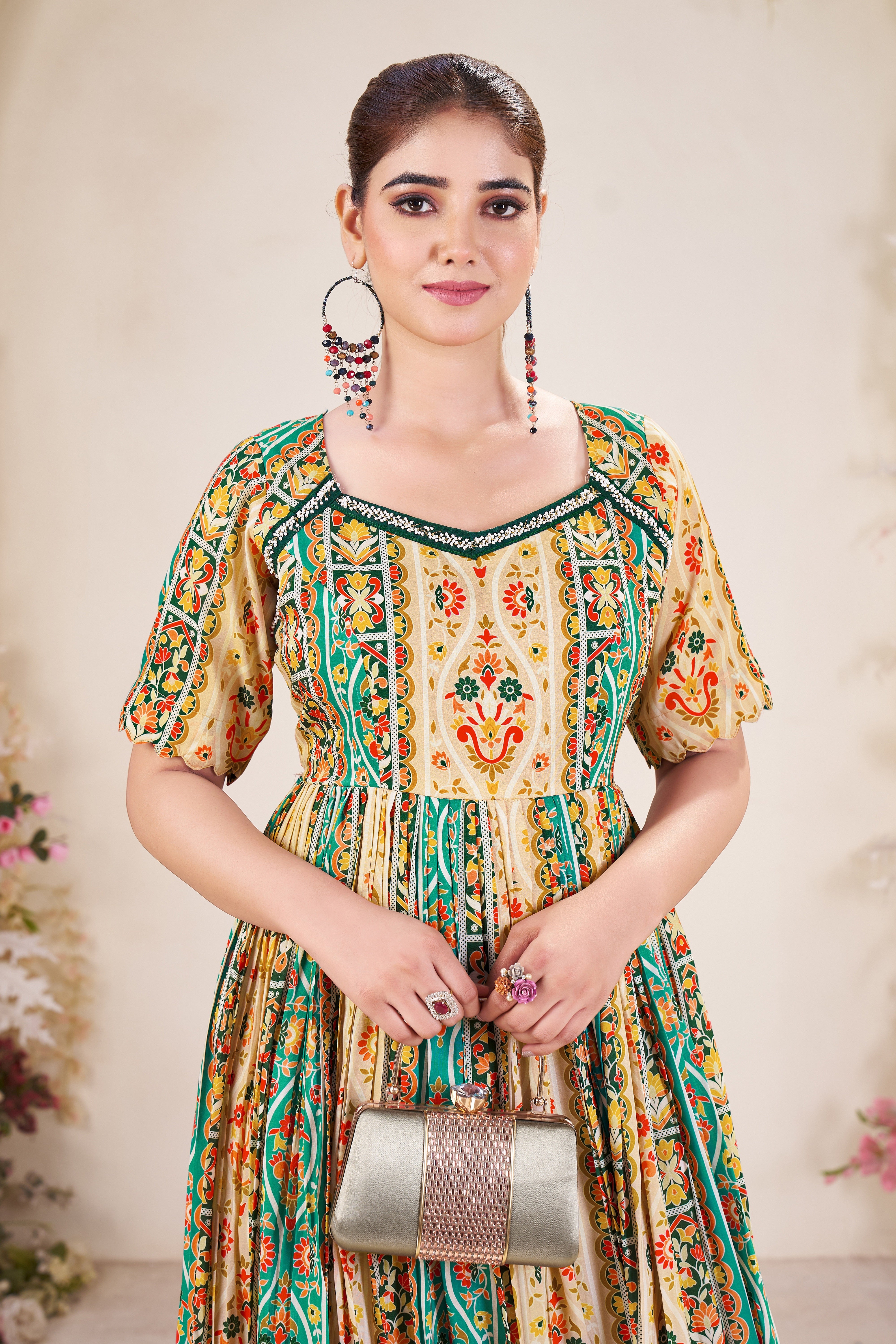 Kastoory-Heavy Fancy Long Western Dress-"Drape yourself in festive elegance with this vibrant muslin masterpiece,Adorned with intricate pearl work and timeless ethnic prints."