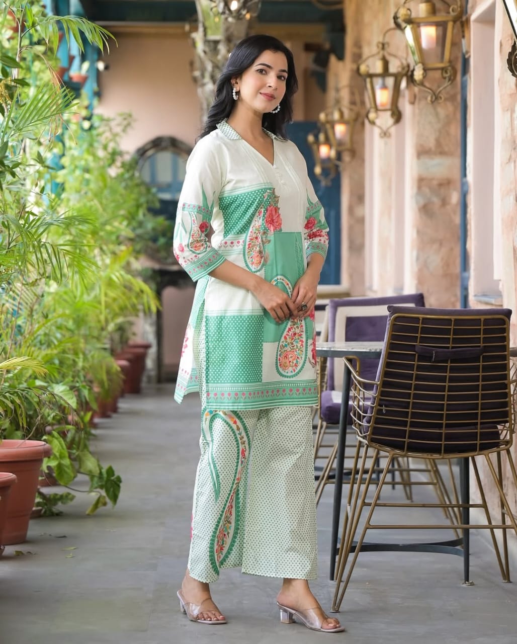 | Pant Design: | Straight Cotton Pant with Coordinated Paisley Floral Print |