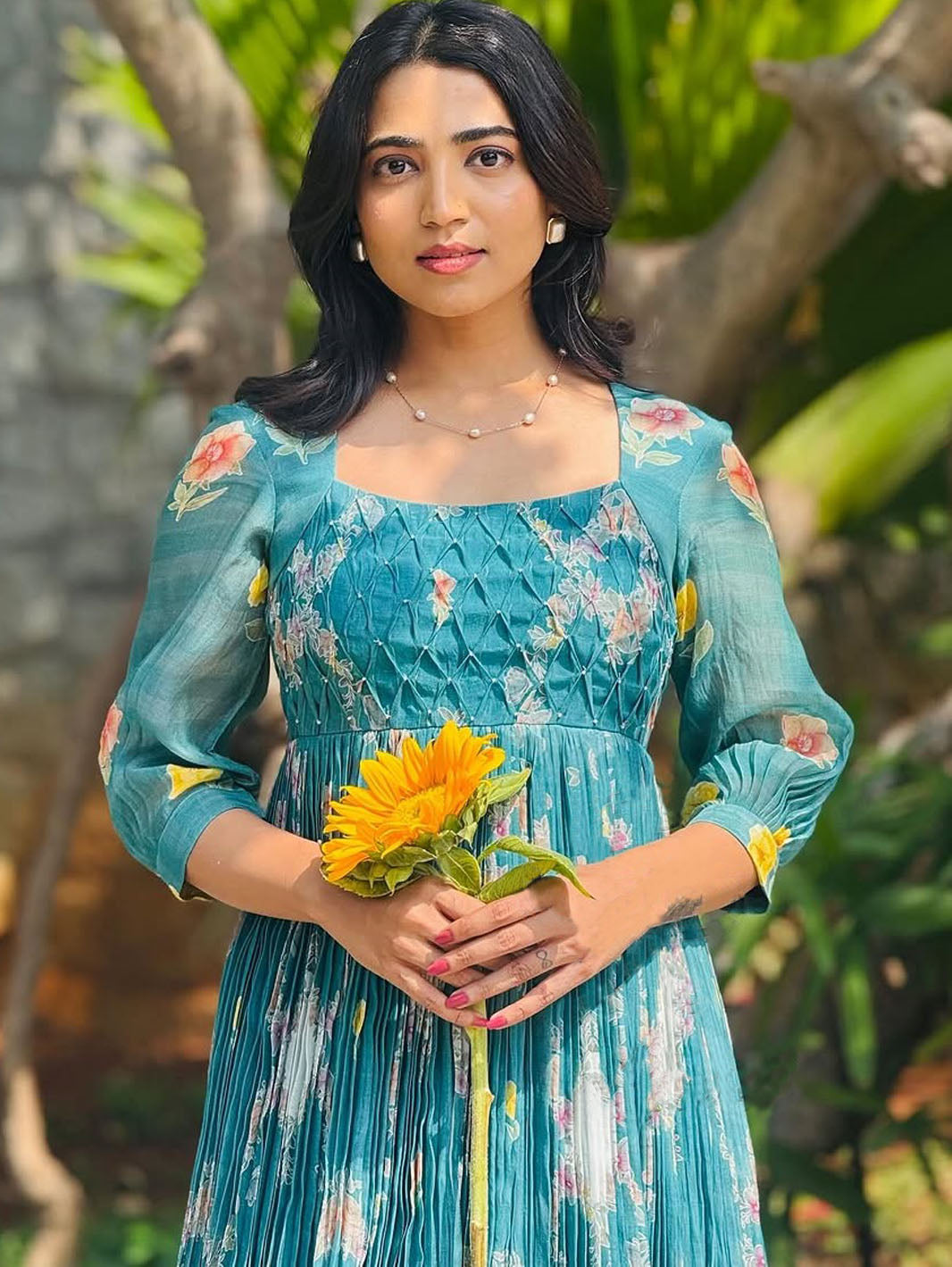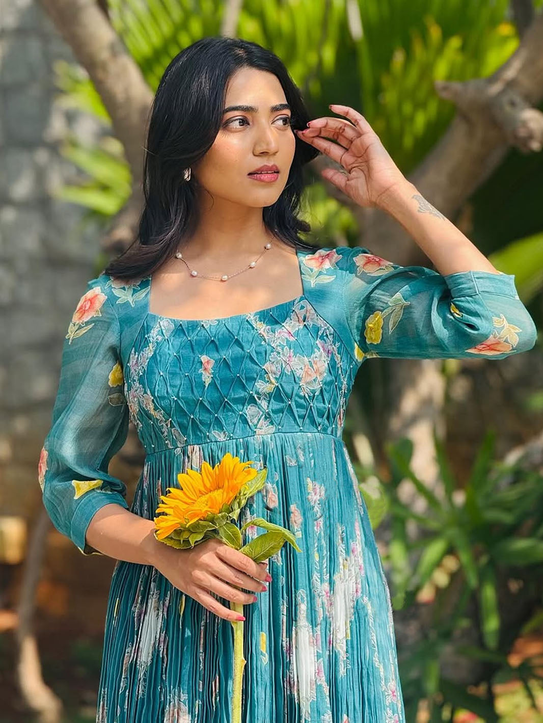 | MISTY-HEAVY FANCY LONG WESTERN DRESS effortless elegance with this aqua-green muslin maxi, adorned with delicate florals and dreamy pleats. With a flattering square neckline, sheer sleeves, and a 6-meter flare, it’s where comfort meets timeless charm. | |