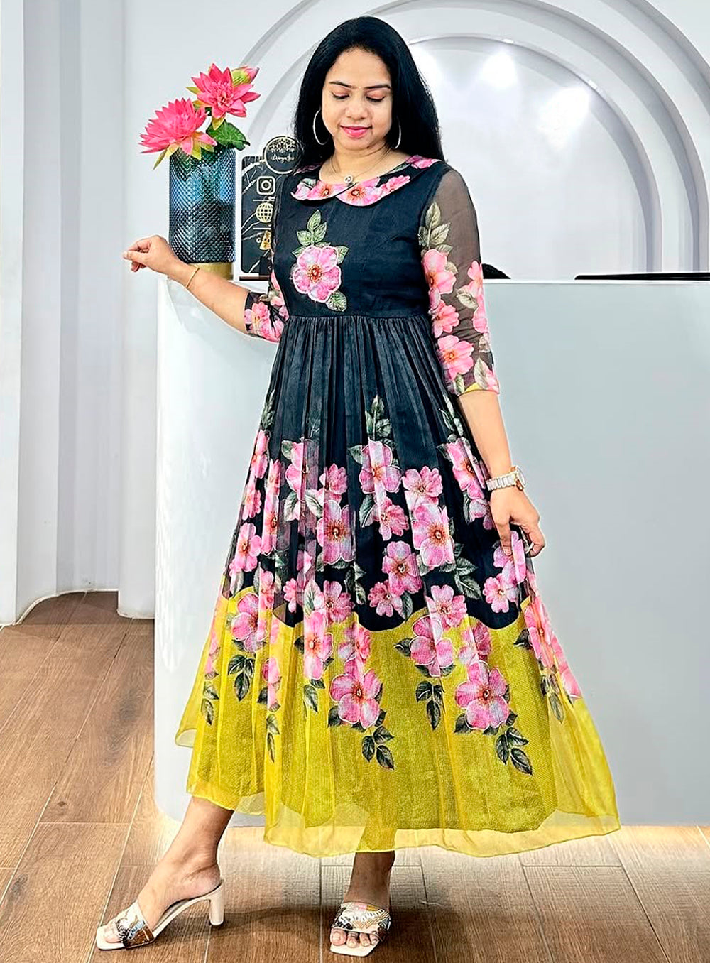 Sayani-Long Fancy Western Dress beautiful dresses are crafted from a mix of dicreb fabric and cotton, ensuring a soft, breathable, and comfortable feel. The floral prints and pleated design add a touch of elegance, making them perfect for casual and festive occasions. Their flowy silhouette and vibrant color combinations enhance the charm and grace of the wearer.